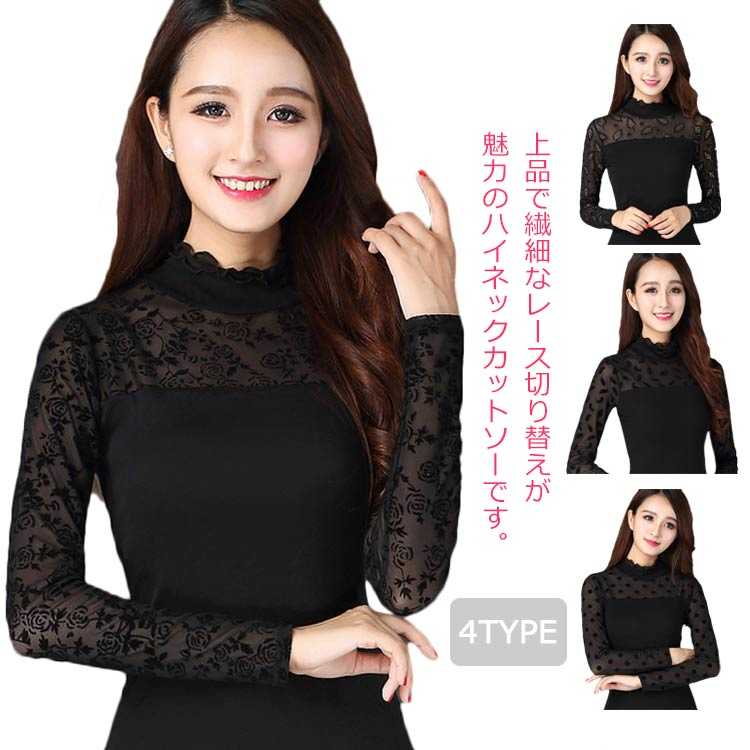 送料無料 インナーシャツ カットソー プチハイネック レースシャツ レースブラウス ハイネック レデ・・・