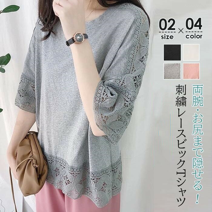 【半額クーポン対象】レースデザイン トップス カットソー 半袖 5分袖 クルーネック ラウンドネック・・・