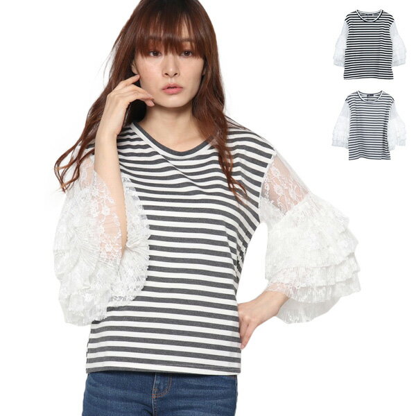 カットソー Tシャツ フリル袖 レース ボーダーカットソー クルーネック レディース グレー ブラッ・・・