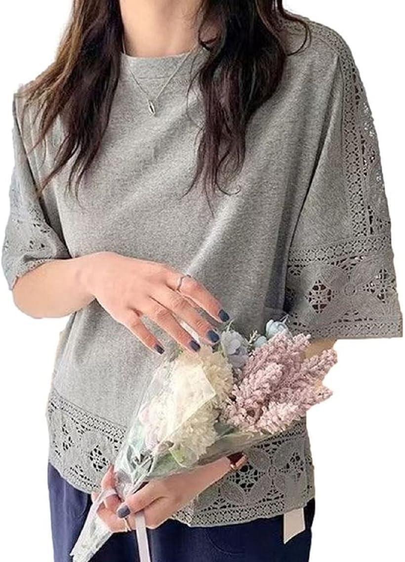 リリカ カットソー レース Tシャツ 5分袖 ラウンドネック ドロップショルダー ゆったりレディース・・・