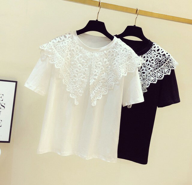 tシャツ レディース 半袖 トップス レース飾り カットソー 体型カバー 丸襟 カジュアル 着痩せ ・・・
