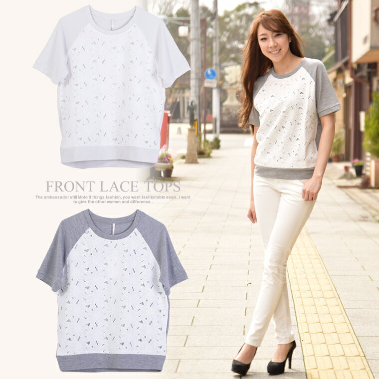 スリットロンT ロンT レディース トップス 半袖 レース切替 カットソー Tシャツ クルーネック ・・・