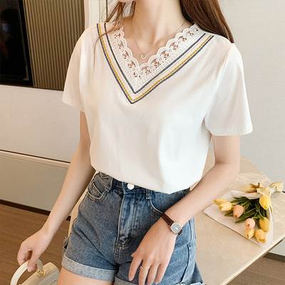 トップス レディース Tシャツ カットソー半袖 Vネック 襟なし レース きれいめ シンプル カジュ・・・