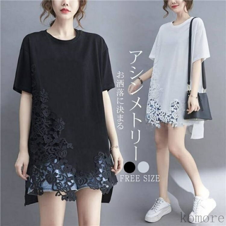 Tシャツ レース 半袖 レディース トップス カットソー ロング ティーシャツ ビッグ プラスサイズ・・・