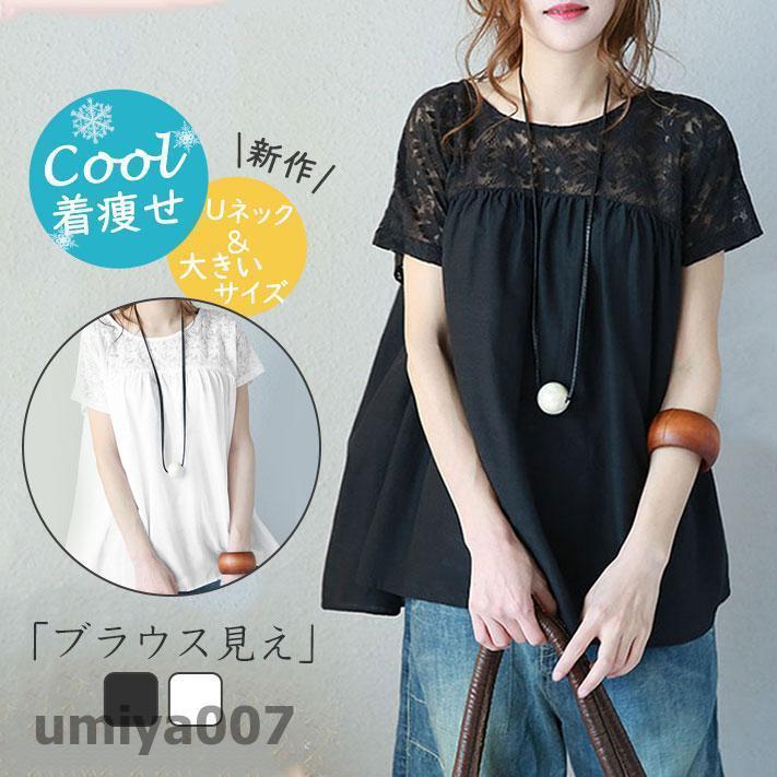 tシャツ レディース 半袖 レース ブラウス ゆったり トップス 春夏 体型カバー カットソー 着痩・・・