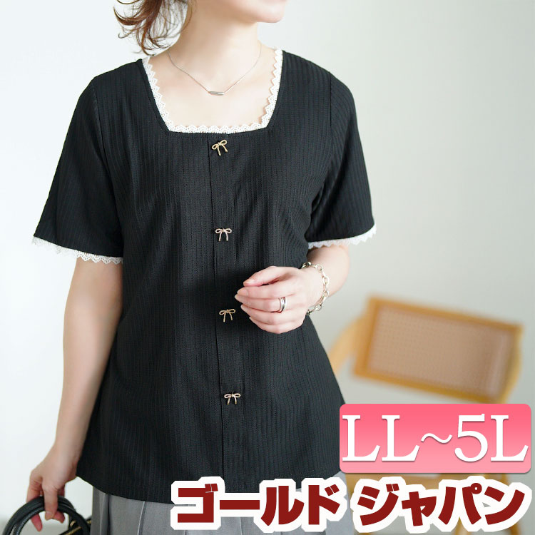 大きいサイズ レディース トップス カットソー ビジューリボンレーススクエアネックリブトップス スク・・・