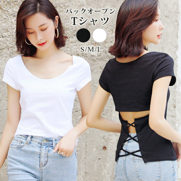 tシャツ カットソー レディース トップス 半袖 ホワイト ブラック 無地 バックシャン レースアッ・・・