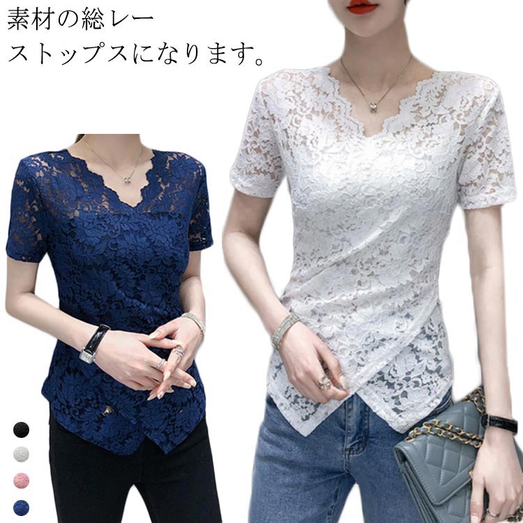 レース トップス レディース 半袖 カジュアル 五分袖 ブラウス カットソー Tシャツ 透かし編み ・・・