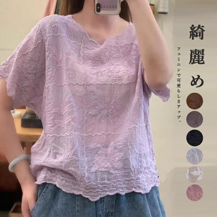 異素材 カットソー レディース シャツブラウス 半袖 夏 透かし編み コットン 5分袖 半袖カットソ・・・