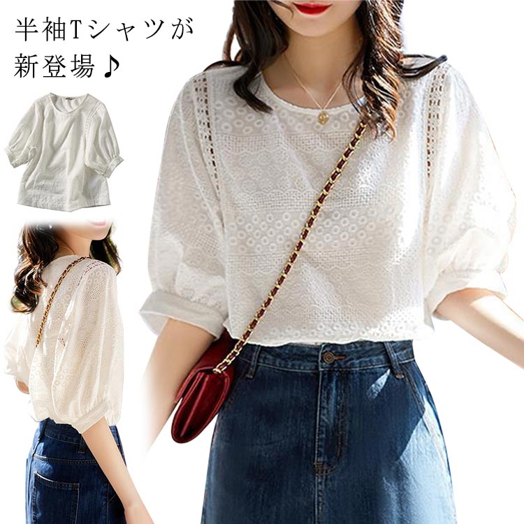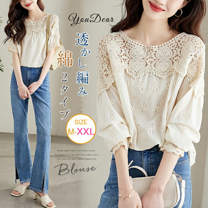 ブラウス 透かし編み 綿 レディース 春夏 半袖 長袖 レディース シャツブラウス トップス カット・・・