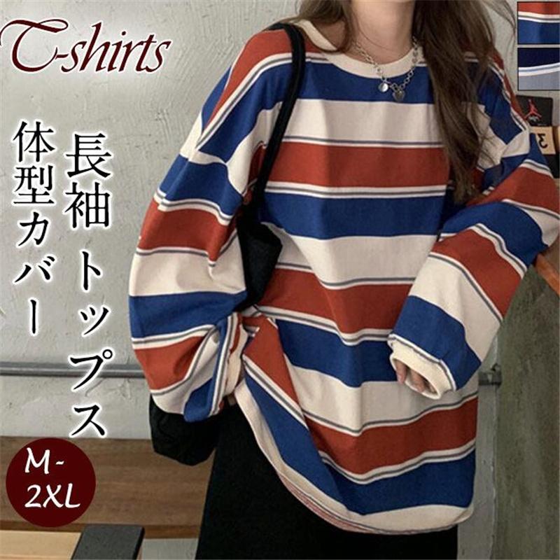 Tシャツ レディース 長袖Tシャツ カットソー トレーナー 長袖 ラウンドネック ストライプ ゆった・・・
