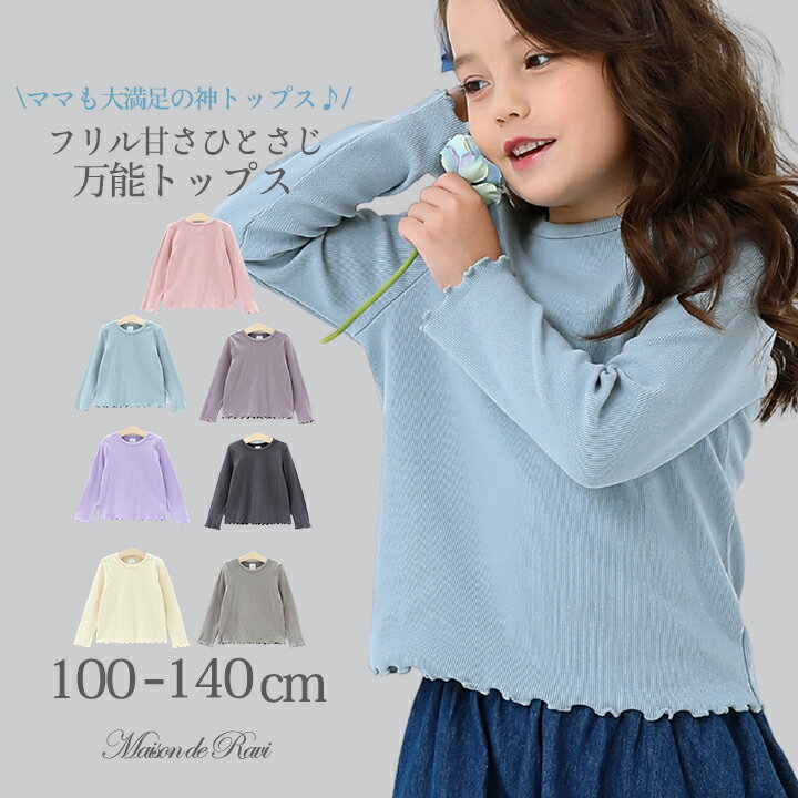 【ヘアゴム全員プレゼント★】女の子 こども服 トップス メロウリブ 長袖 カットソー 無地 キッズ ・・・