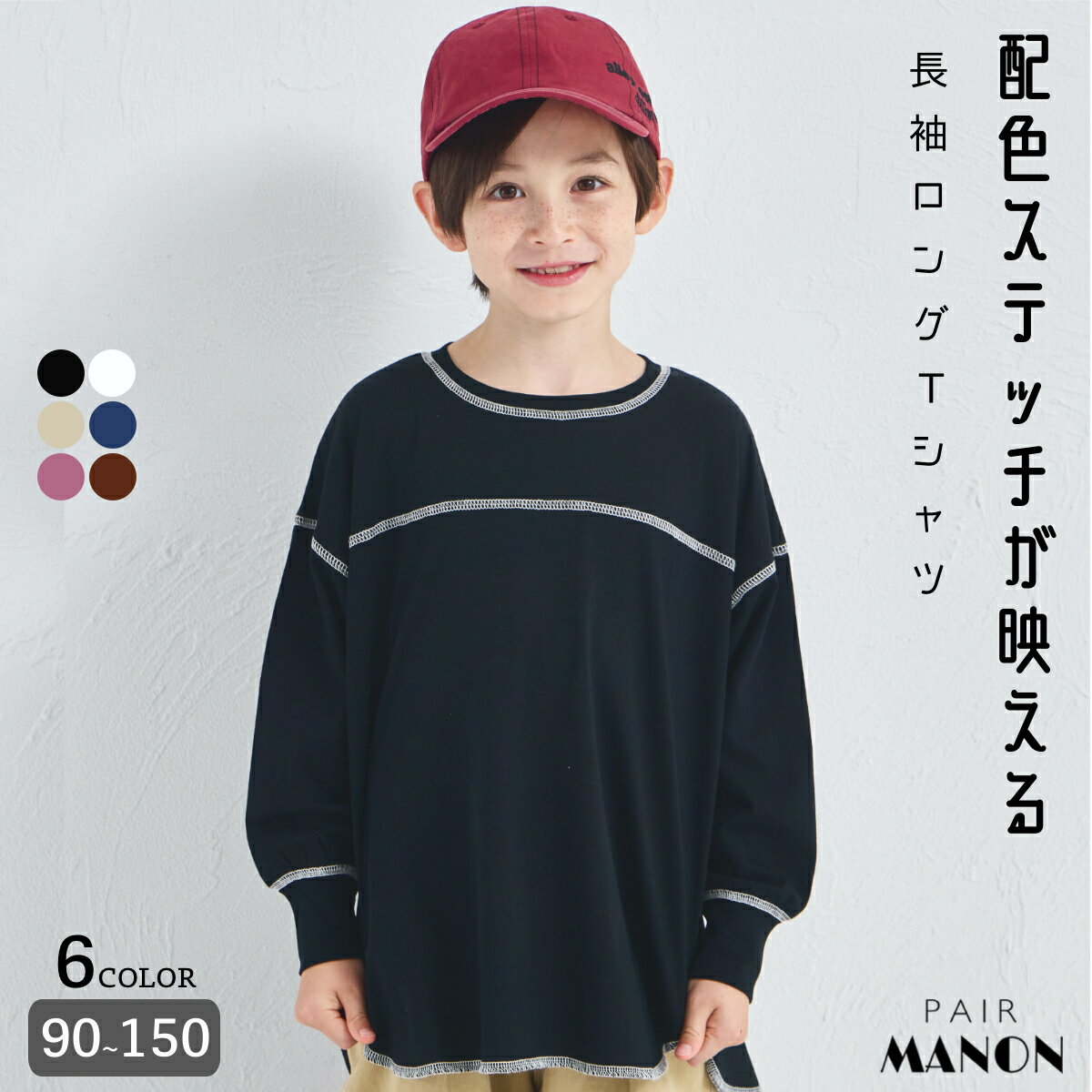 【綿100%】ユニセックス 配色ステッチ 刺繍 ロング丈 長袖Tシャツ こども キッズ ユニ ボーイ・・・