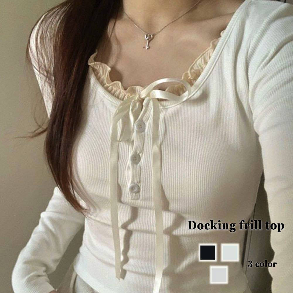 Tシャツ レディース ドッキングフリルトップス おしゃれ ブラック コーデ キャンバー 厚手 冬 V・・・