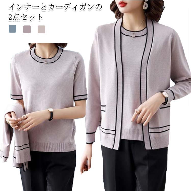 2点セット レディース アンサンブル ニット カーディガン クルーネック 婦人 セーター 大きいサイ・・・