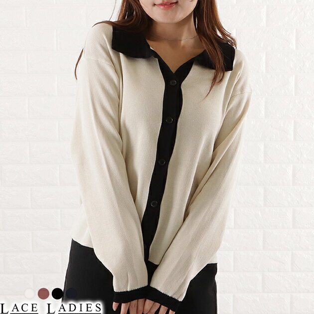 バイカラー 襟付き カーディガン レディース トップス ニット 長袖 秋 冬 春 シンプル ナチュラ・・・