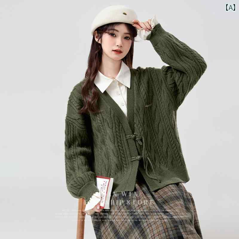 カーディガン 秋冬服 フェイク レイヤリング 襟 シャツ 重ね着風 ニット セーター 深緑 レディー・・・