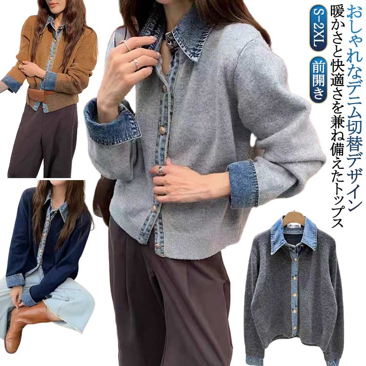 デニム切替 レディース 羽織り ニットカーディガン ニット カーディガン 長袖 トップス ジャケット・・・