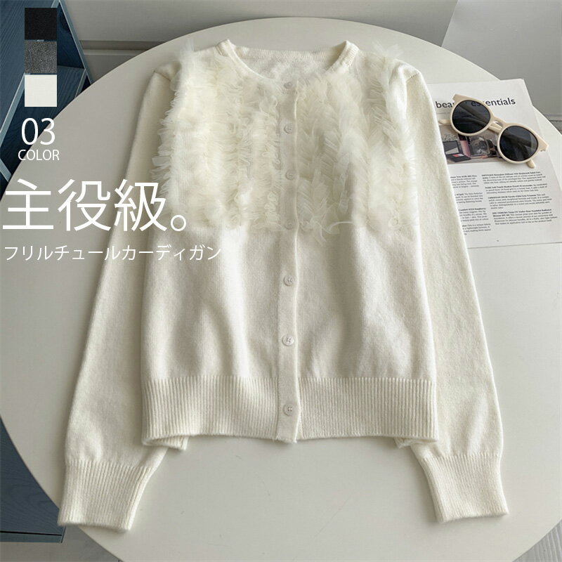 カーディガン レディース フリルチュール ニットカーディガン 秋冬 おしゃれ きれいめ 無地 白 黒・・・