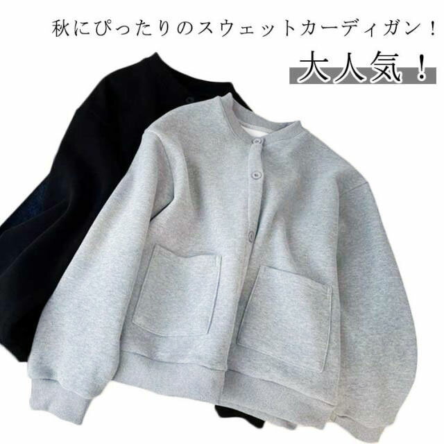 スウェット ブルゾン レディース 長袖 カーディガン 春秋 アウター 無地 スタジャン ノーカラー ・・・