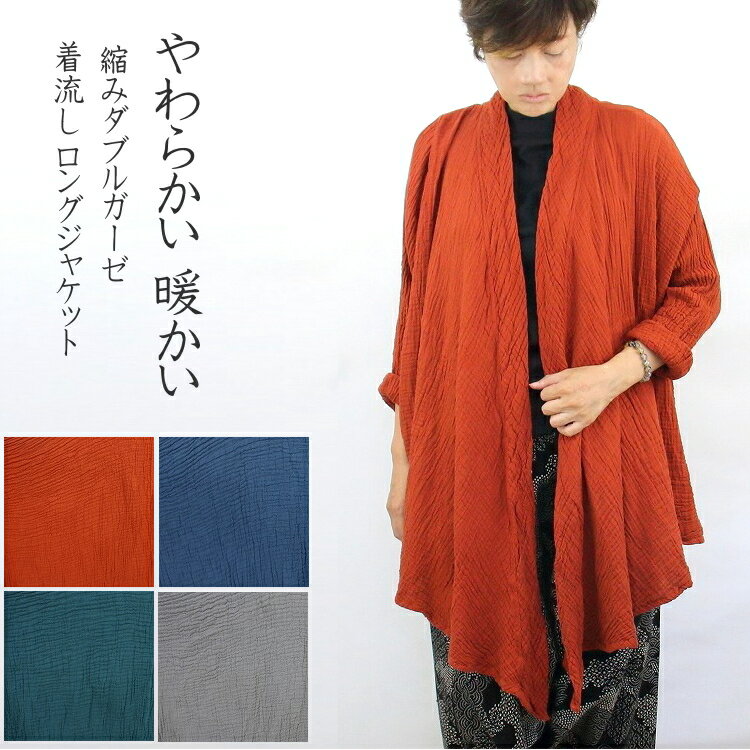 【送料無料】縮み ダブルガーゼ 着流し ロングジャケット ノーボタン 羽織り コットン100% やわ・・・