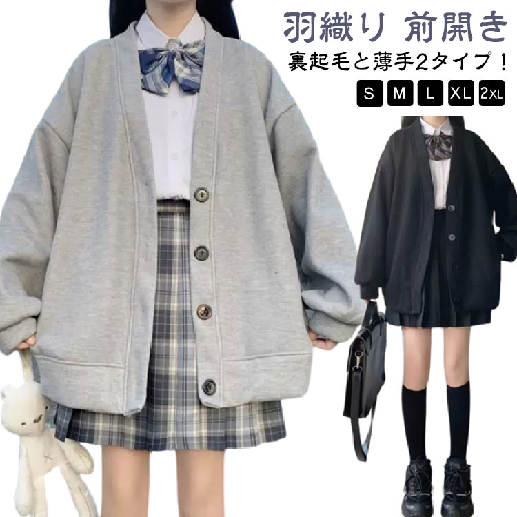 Vネック スウェット生地 スウェットカーディガン ボリューム袖 裏起毛と薄手2タイプ 無地 スクール・・・