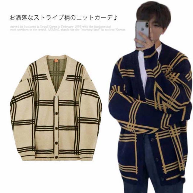 ニットカーディガン メンズ 長袖 アウター Vネック セーター ストライプ柄 ニット トップス 肩掛・・・