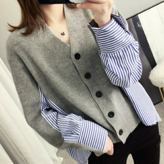 羽織 ニット カーディガン ストライプ柄 シャツ切替 Vライン 大人カジュアル おしゃれ 春 新作 ・・・