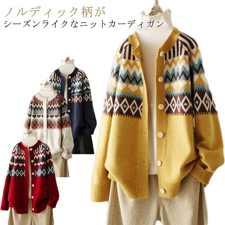 ニット カーディガン 長袖 レディース レトロ ニットカーディガン ノルディック柄 求心柄 Uネック・・・