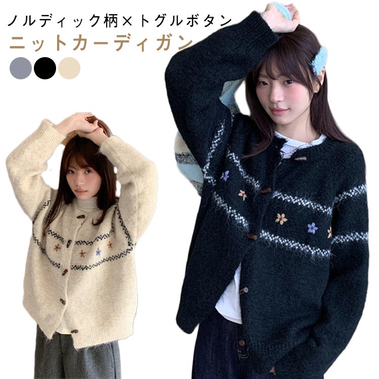 ノルディック柄カーディガン レディース ニット セーター 羽織り 長袖 クルーネック ニットカーディ・・・