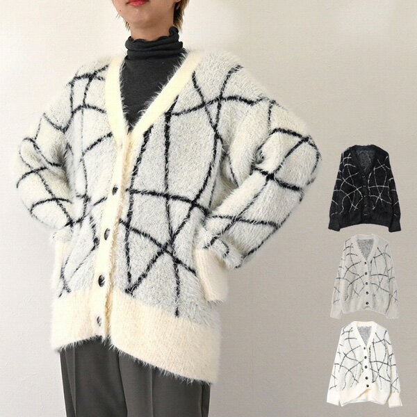 ニットカーディガン カーディガン シャギー ライン Vネック 長袖 トップス レディース アイボリー・・・