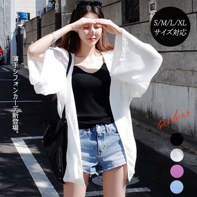 カーディガン レディース シフォン 薄手 7分袖 ゆったり 長袖 無地 大きいサイズ 透け感 冷房対・・・
