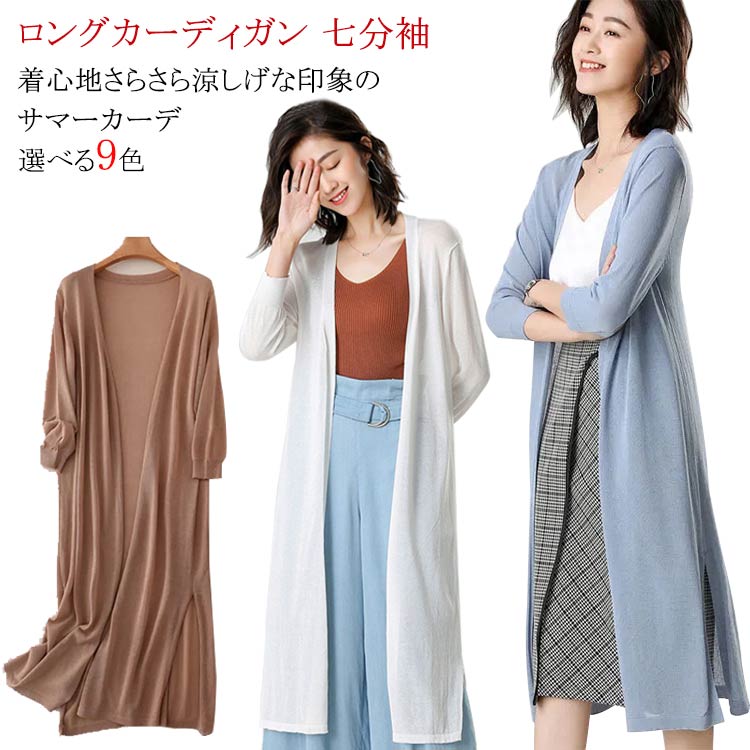 ロング丈 サマーカーデ カーディガン レディース 羽織り 無地 前開き 7分袖 薄手 ボタン無し ラ・・・