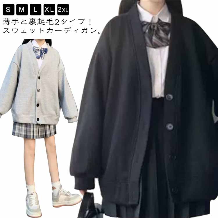 薄手と裏起毛2タイプ スウェットカーディガン レディース グレー 前開き スクールカーディガン Vネ・・・