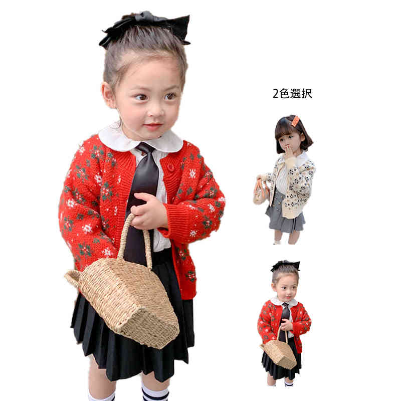 ニットカーディガン キッズ 春秋 ニットショートカーディガン 丸襟 長袖 花柄カーディガン トップス・・・