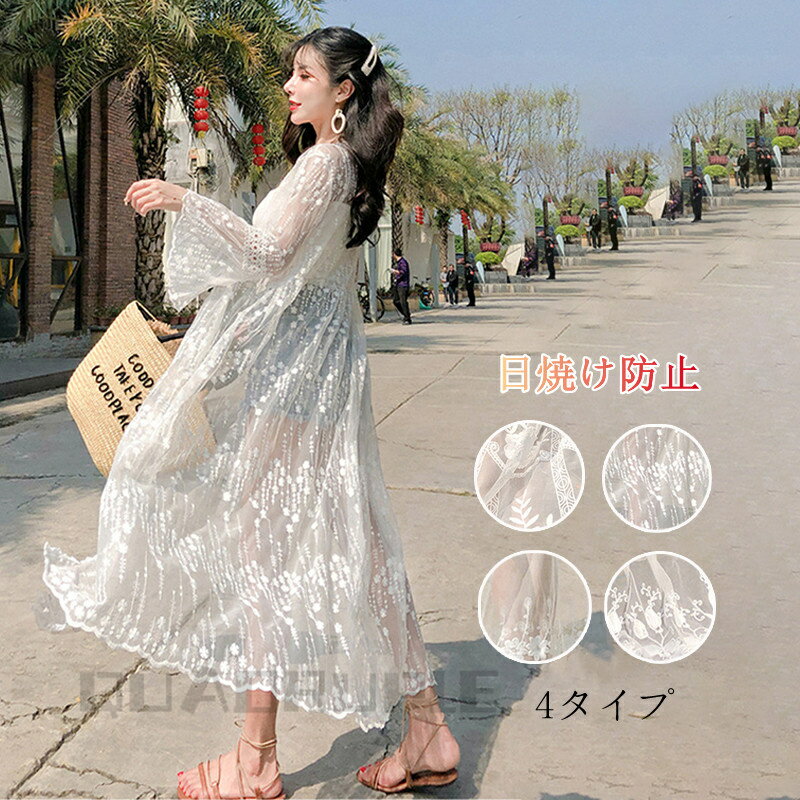 花柄レース カーディガン ロング UV ゴルフ カーディガン 夏 薄手 透け 総レース 前開き 夏 ・・・