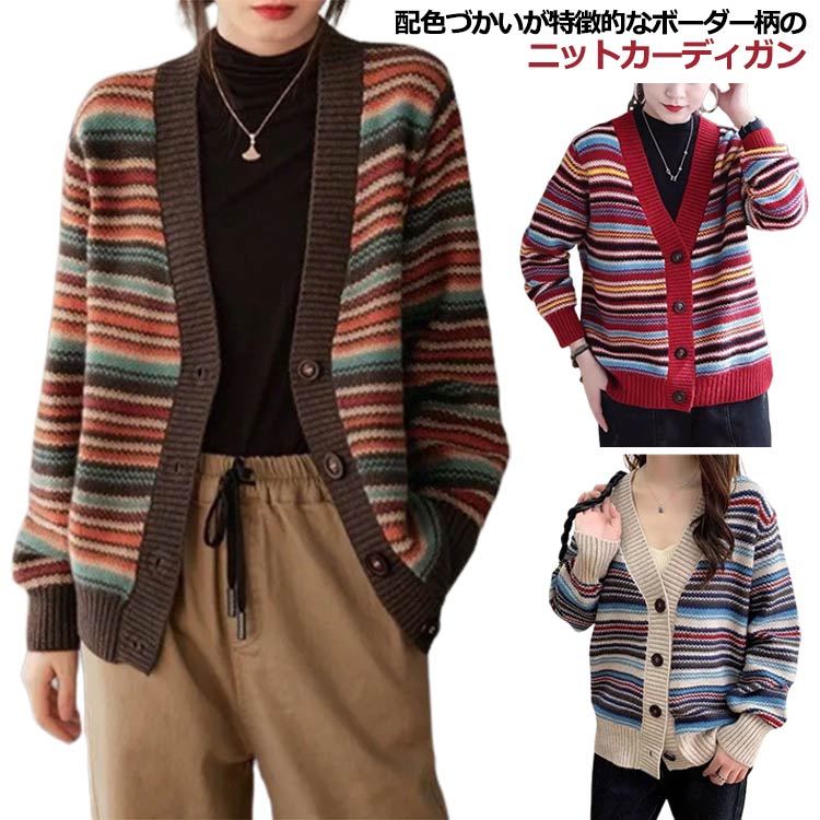 ニットカーディガン レトロ ボーダー柄 レディース ニット カーディガン Vネック ショート丈 ニッ・・・
