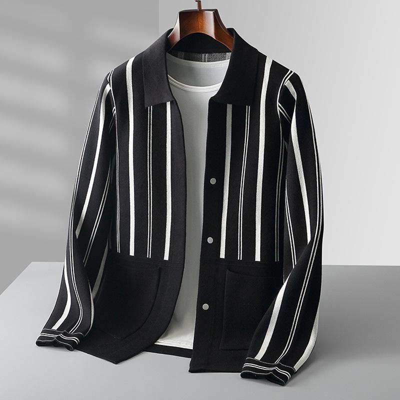 ニット カーディガン 男性用 大きいサイズ 長袖 襟付き ボーダー柄 黒 白 黒 茶色 春秋