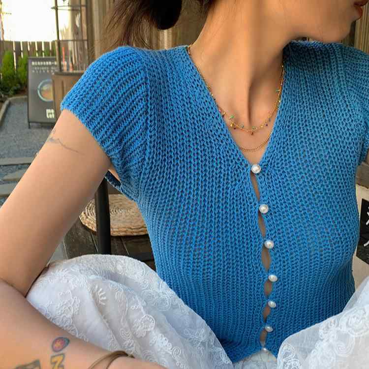 ニット レディース カーディガン 半袖 Vネック パール 薄手 ブルー 青色 咖色 茶色系 きれいめ・・・
