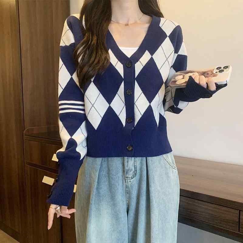 ニット カーディガン レディース Vネック トップス 長袖 ひし形 チェック柄 グレー 茶色 青 黒・・・