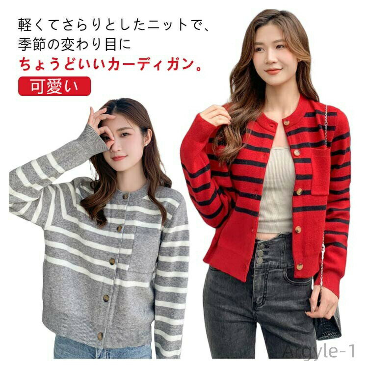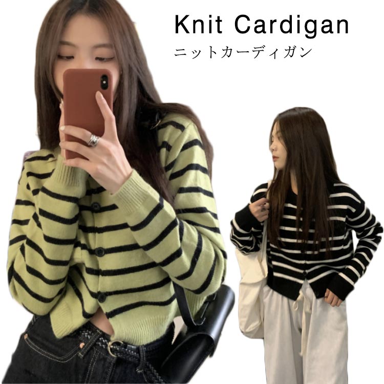 ニット 秋 カーディガン 春 ショート丈 クールネック 長袖 ボーダー柄 カーディガン ニット ショ・・・