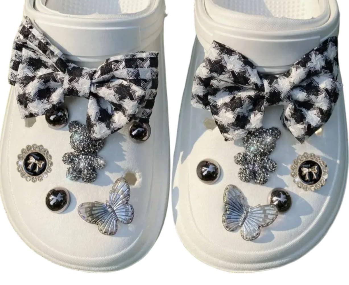 【送料無料】ブラック ホワイト リボン バタフライ くま 14個 クロックス ジビッツ シューチャー・・・