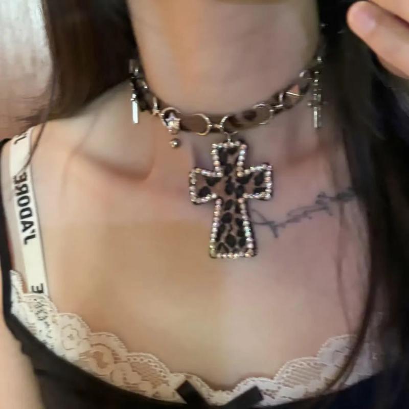 ネックレス ユニセックス パンク ロック スタイル ヴィンテージ ヒョウ柄 クロスモチーフ チョーカ・・・