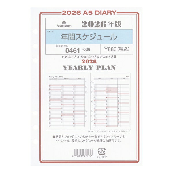 2026年 A5サイズ 年間スケジュール システム手帳リフィル