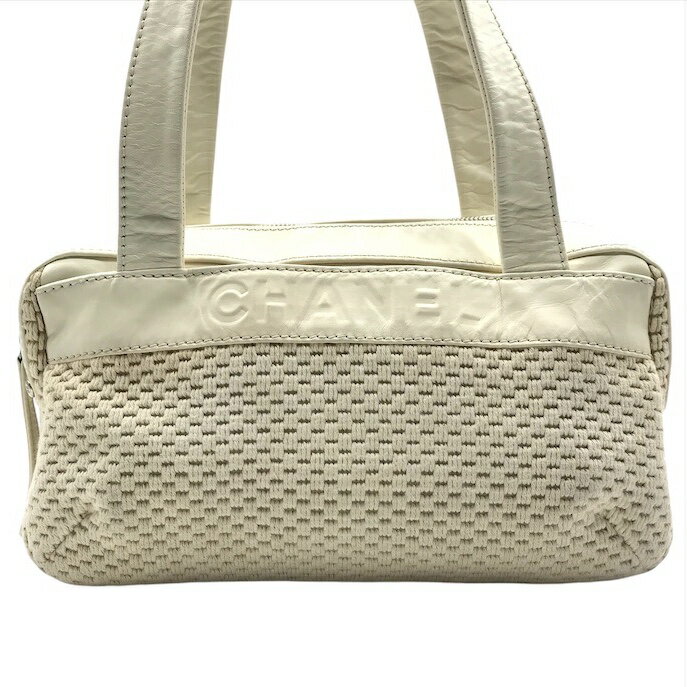 【中古】良品 CHANEL シャネル ラムスキン レザー コットン ニット ハンド バッグ アイボリ・・・