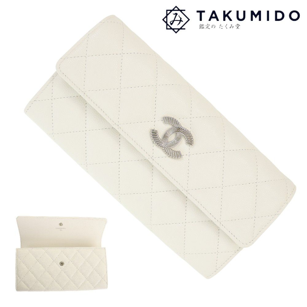 シャネル 二つ折り長財布 ロングフラップウォレット ココマーク マトラッセ 中古 ホワイト キャビア・・・