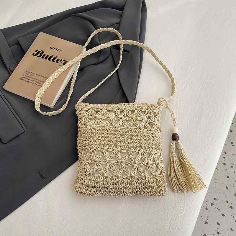 かごバッグ レディース ミニ スクエア ショルダーバッグ 斜め掛け タッセル 両面編み 小銭入れ付き・・・