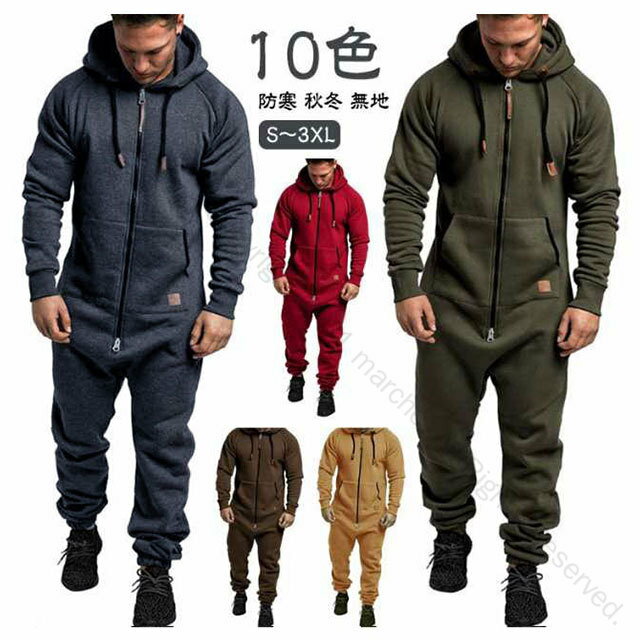 裏起毛 オールインワン 防寒 パーカー 無地 長袖 フード付き ジップアップ 秋冬用 オーバーオール・・・