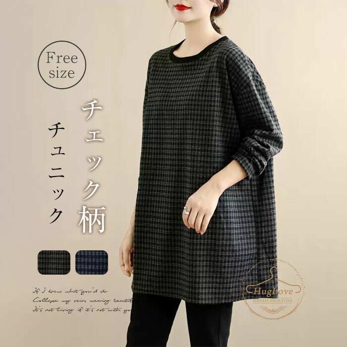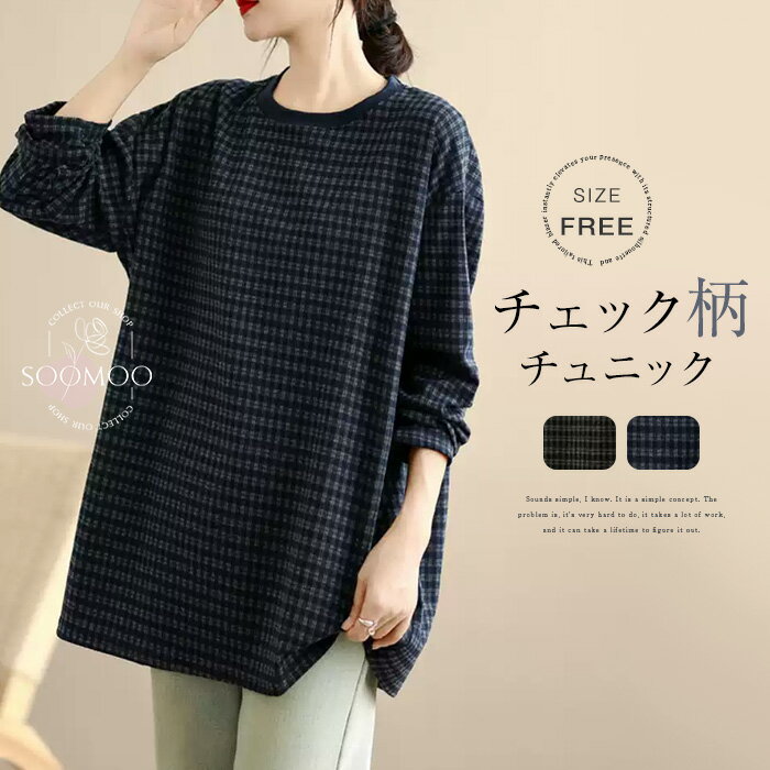チュニック レディース カットソー 長袖 チェック クルーネック トレーナー チェック柄 長袖tシャ・・・