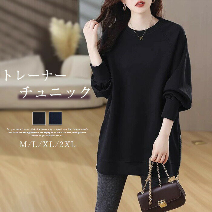 トレーナー 長袖 レディース 春秋 スウェット チュニック クルーネック サイドスリット カットソー・・・